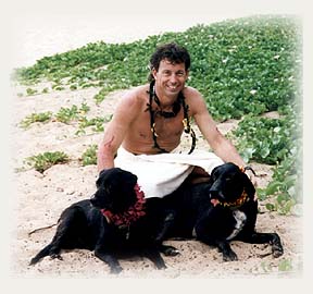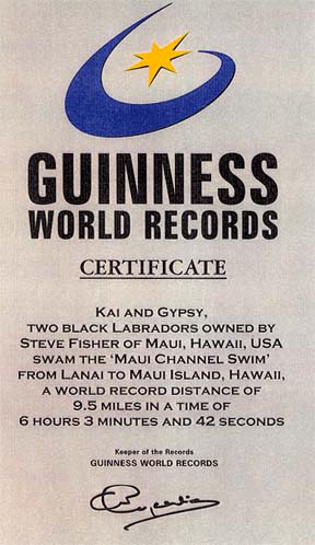 Kai and Gypsy in 1996 after their record-breaking swim across the Au'au Channel between Lanai and Maui. Owner Steve Fisher trained with the dogs and swam the entire distance with them under the watchful eyes of an escort boat and with full knowledge of the Maui Humane Society. Below is the certificate from Guinness acknowledging their feat.