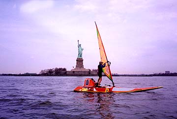 The sail around the Statue was on a cold, calm New York day. Far from the warm sunny waters of Maui, where this sleek craft has experienced 40 knot winds and 25' seas in the Pacific.Many times I am asked if I would do the trip again or another one similiar to it and my answer is "Yes", but only with real support this time. The quest to be the first to windsurf from California to Hawaii took ten years and I had little support. The entire journey was financed by myself, as all sponsors that I contacted declined support, stating that the trek was too risky. I have ideas for another trip and if you or your company would like to know more, please contact me at any time, by clicking here